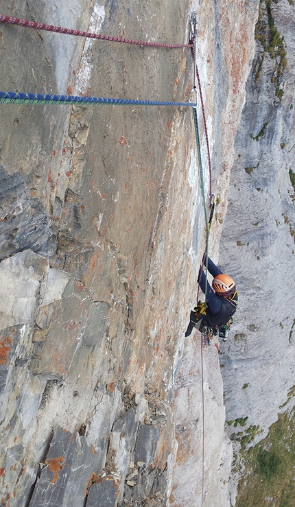 : Establishing pitch 4 of Sette secondi, NW Face of Cima delle Saline, Ligurian...