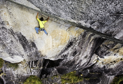 Fessura del Caret: Silvestro Franchini climbing the roof on pitch 3 of Fessura del...