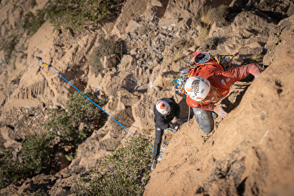 Fay Manners and Solenne Piret making the first ascent of 'Win Oumalou' on Jebel...