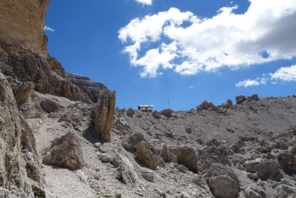 Scala del Minighel and Tofana di Rozes circuit: Rifugio Giussani finally springs into view