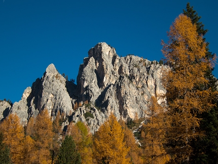 Gallo George: Marco Sterni climbing Gallo George, Muraglia del Giau, Lastoni di Formin, Dolomites...