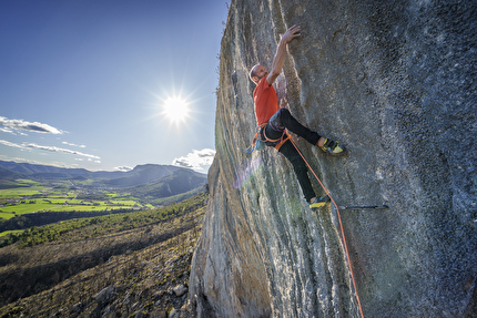 Seb Bouin making the first ascent of 'Le Champ des Muses' (9b) at Romeyer...