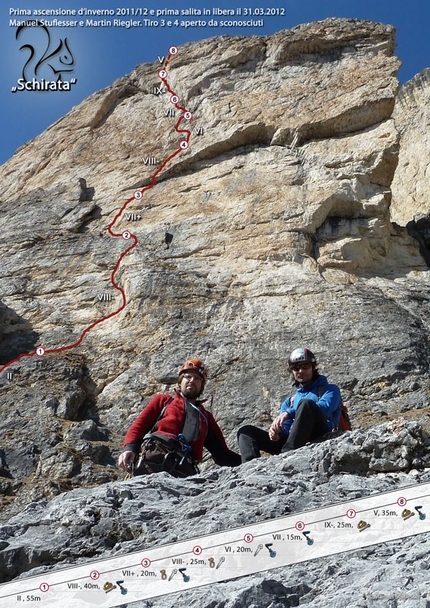 Schirata: Manuel Stuflesser and Martin Riegler on the Cengia dei Camosciledge after having made...
