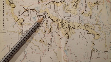 The route line of Oblivion, Piz Ander, Dolomiti, first ascended by Simon Gietl and...
