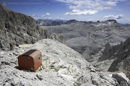 The old Fiamme Gialle bivouac, previously located on Cimon della Pala in the Dolomites