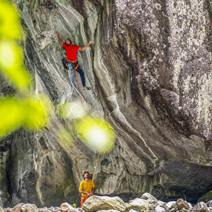 Cédric Lachat climbing 'Coup de Grâce' in Val Bavona, Switzerland
