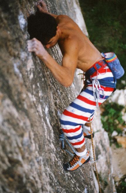 Val Salarno: Mario Roversi bolting the variation to Forze Oblique, Avancorpo, 1985