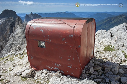 The old Fiamme Gialle bivouac, previously located on Cimon della Pala, Dolomites