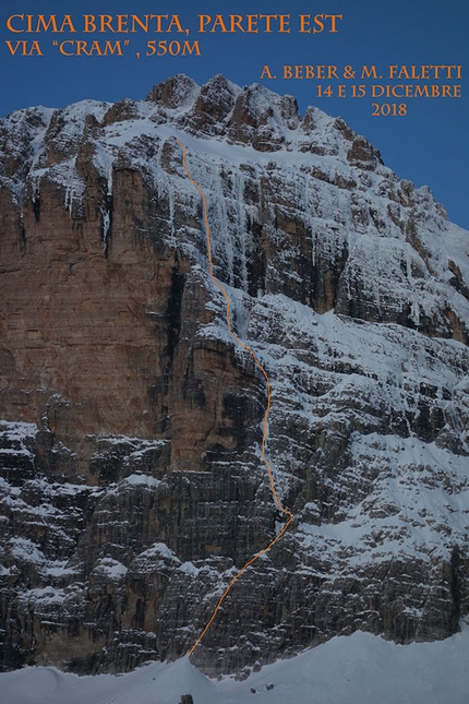 Beautiful winter climb up the NW Face of Cima d'Ambiez in the Brenta Dolomiteds. The new mixed climb is a direct version of Passaggio Solista, established by Tomas Franchini solo in May 2013. The first two pitches are exteremely difficult...