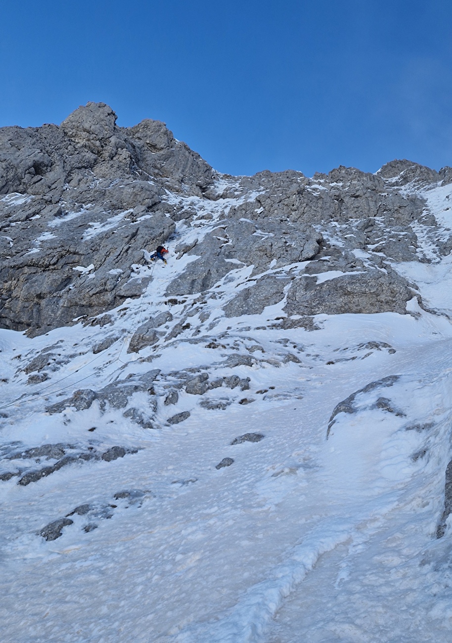 Traverse right across the col and pass a small tower near the summer route Triestinon. A short mixed step leads onto the ridge.