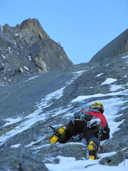 After some fun initial pitches, the route connects the snowy gully of Full Love... for dry and ice with the exit of the 1942 Livacic - Martinetti route, of which there is little news about "winter garb" repeats, apart from perhaps that by Nisbet and Spinks in 1979 (see Damilano: "Neige, Glace et Mixte").