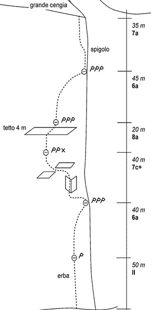 Bubu Bole climbed the route up to mid-height ledge, the Cengia dei Camosci, where almost all climbers then return to the valley floor. The crux of the route is comprised of two pitches that weave through the stepped 4m roofs, and now go free at 7c+ and 8a.