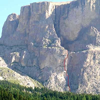From Passo Sella continue for a few kilometers to reach a long straight section and parking spaces on the right, immediately beneath the south face. From Canazei continue part the bar/restaurant Monti Pallidi to the hairpin bend and parking spaces immediately afterwards on the left. Access