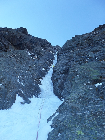 Big ice and mixed climb up the NE Face of Hochbirghöhe. The first 200m offer gentle WI4 climbing. Climb straight up the snow slope (watch out for snow conditions) past two short steps (WI2). After 5 steep pitches the first ascentionsits trended leftwards for a further 3 pitches to reach the gully again. Now follow the easiest line past M3 70° ice to the the summit. Descent