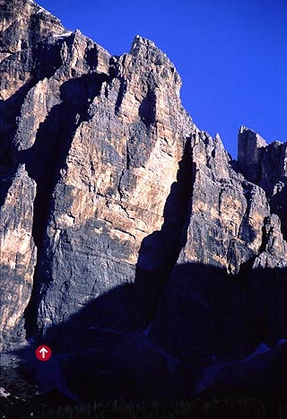 A relatively easy and popular climb (UIAA 4 and 5, one 6- crux) up the left-hand arête of the Pilastro della Tofana di Rozes. The three hard pitches traverse leftwards past two large yellow roofs at half height. Paradoxically, the large quantity of in-situ gear off-route makes correct route finding difficult!