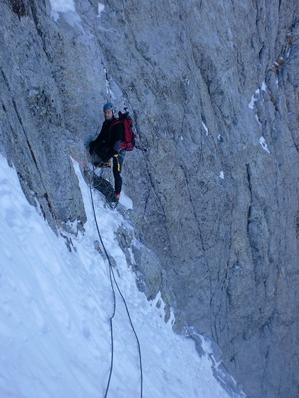 A very beautiful mixed outing, both complete and demanding: rock and mixed climbing leads to a small ledge on the left and then, around the corner, a beautiful corner rises sharply upwards. This is followed by another, with a thin sliver of ice. The climbing almost moves you to tears and you wish it would never end! A couple of slab, snow and mixed terrain then lead to the easy finishing slope and the col. Well done Patrick and Giulia!