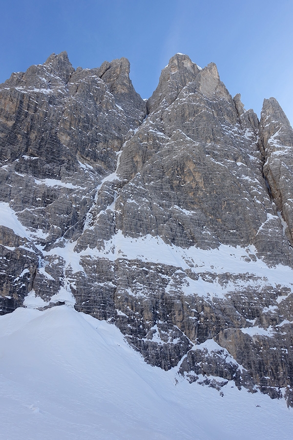 Access2350m. The start of the first pitch can vary according to the snow depth, because large avalanches often deposit a lot of snow here meaning that the base varies. Alternatively, traverse in from the Alpinisteig (along the rocky ledge) to the first belay.
