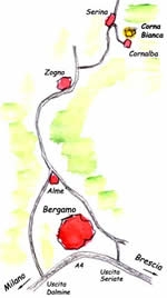 Dall’ autostrada A4 Milano-Venezia, uscita Dalmine e a sinistra in direzione Val Brembana, dopo 11 km, all’innesto sulla S 40, ancora a sinistra per Val Brembana. Passato Zogno, in località Ambria (dopo 22 km dall’uscita) si gira a destra per Zamba-Cornalba e si entra in Val Serina. Si percorre il magnifico orrido dove si trova l’Antica Fonte Bracca e dopo altri 10 km, si gira una prima volta a destra con indicazione Cornalba ed 1 km dopo una seconda volta ancora a destra. Giunti in paese seguire l’indicazione centro e poi i segnali palestra di roccia. Nei pressi del Bar-Ristorante Vico, all’occorrenza anche locanda (tel. 0345-66446), ci sono 3 comodi parcheggi nel giro di un centinaio di metri. Dal retro del bar si sale lungo una strada che diviene in breve sentiero e in 10’ si arriva alla base della falesia.