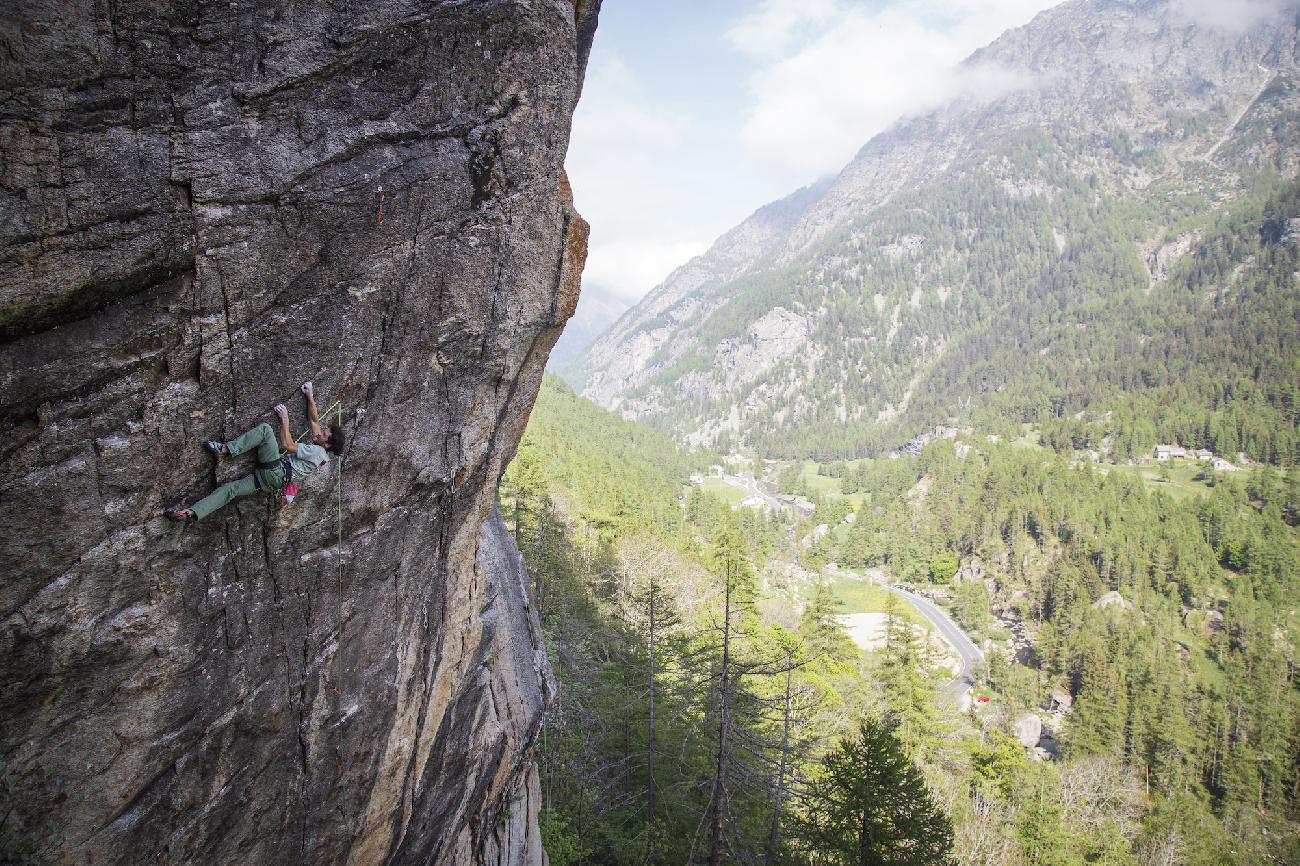 Andrea Migliano in arrampicata alla falesia del Dado, Valle dell'Orco