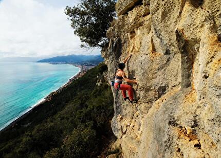Marco 'Thomas' Tommasini in azione durante la fase di chiodatura a Finale Ligure