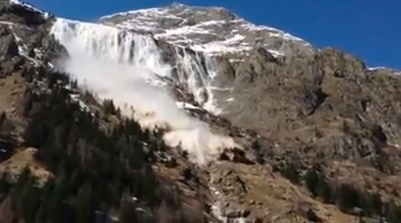 Il filmato della valanga di neve e roccia di fronte alla via Ferrata de Saint Christophe en Oisans in Francia.