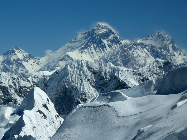 La bellissima vista su Everest e Lhotse dalla cresta ovest di Kang Nachugo, Himalaya