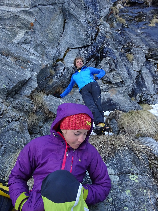 Federica Mingolla e Luca Schiera, prima di salire Delta Minox, Pilastro del Scingino, Cavalcorto, Val Masino, il 20/03/2016 insieme ad Andrea Gaddi