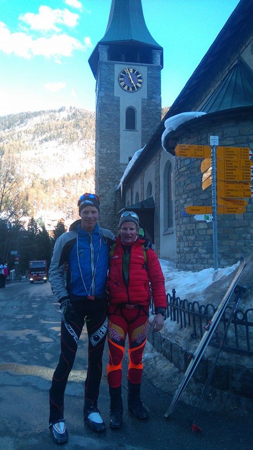 Bastien Fleury e Olivier Meynet alla chiesa di Zermatt, dopo il nuovo record velocità sulla classica Haute route scialpinistica Chamonix - Zermatt stabilito il 21/03/2016 in 16:35