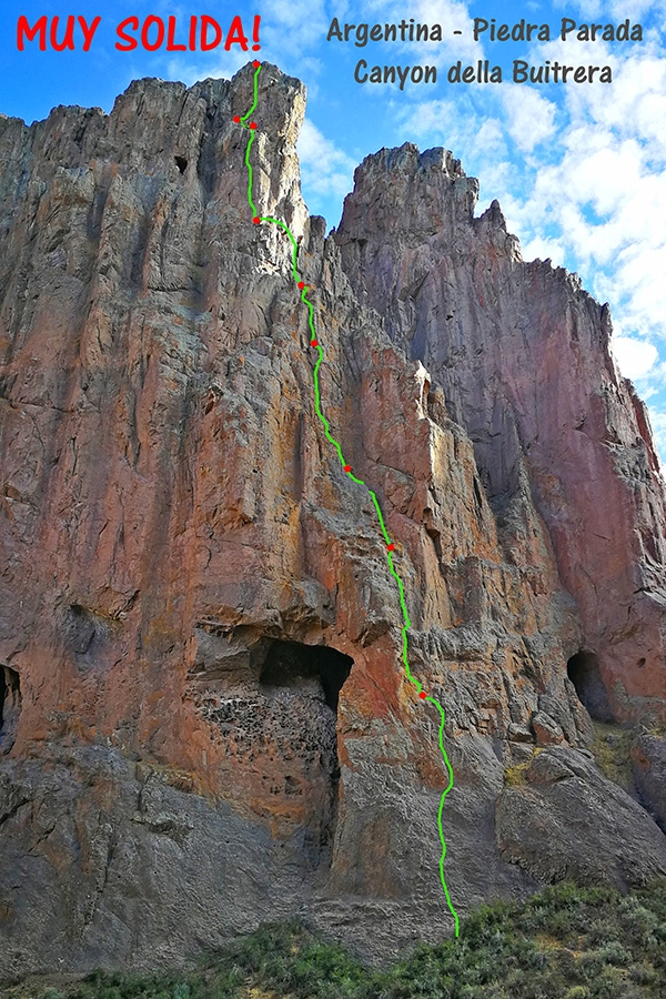 Il tracciato di Muy Solida!, Canyon della Buitrera, Piedra Parada Patagonia, aperta da Luca Giupponi, Rolando Larcher, Nicola Sartori 03/2018