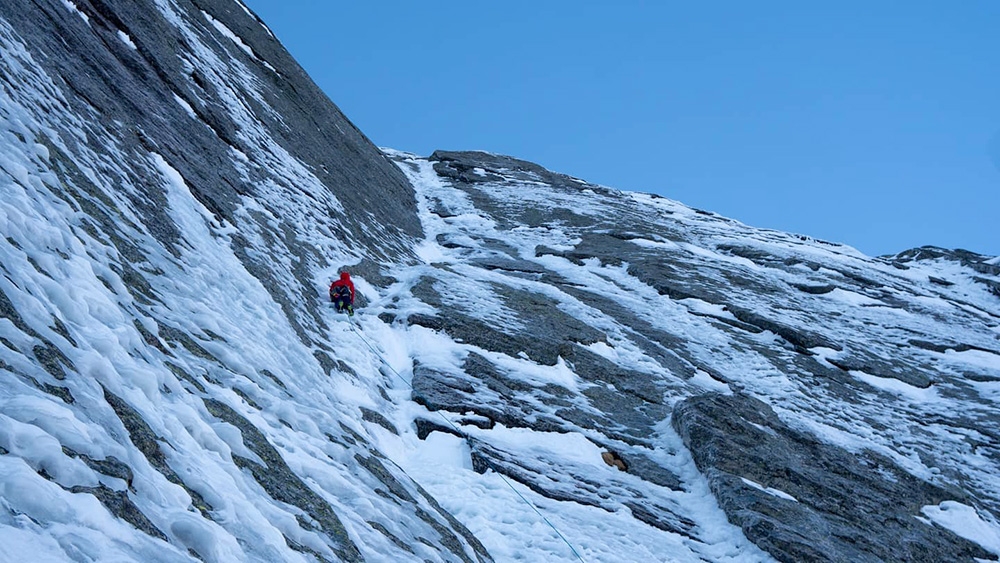 Marcel Schenk e David Hefti salendo Amore Supercombo sul Pizzo Badile il 27/11/2020