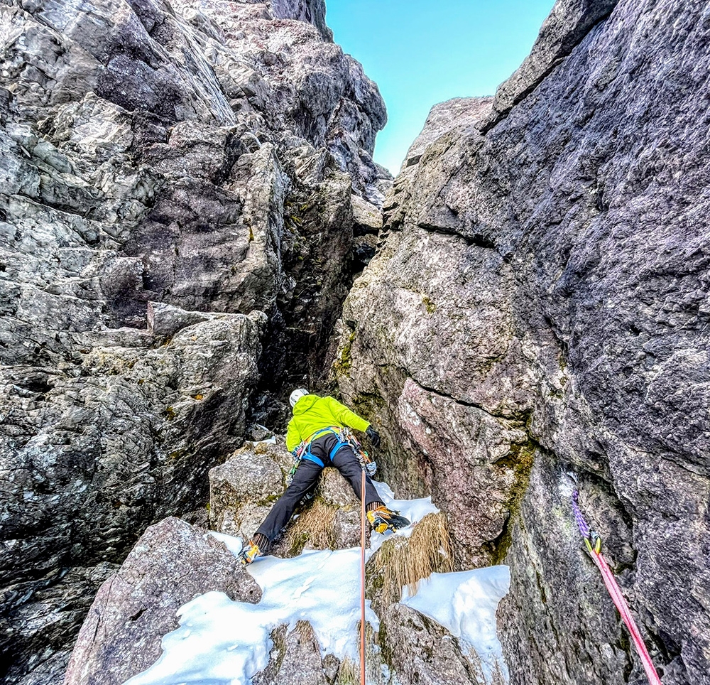 Cristian Candiotto in apertura su No War alla parete nord del Monte Pietra Quadra, Alpi Orobie (Cristian Candiotto, Mattia Trabucchi 09/03/2022)