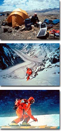 In alto: Al campo base del Muztagh Ata. In mezzo: Hans Kammerlander sul K2. In basso: Kammerlander in discesa dall'Everest