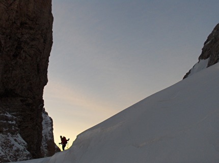 Schiara scialpinismo: attesa dell'alba al culmine della Forcella del Marmol