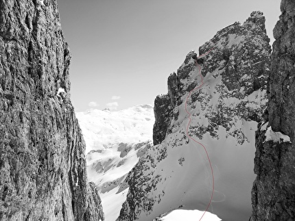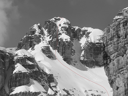Il tracciato della nuova linea sulla parete nord-est della Cima delle Fede (2953m), Pale...