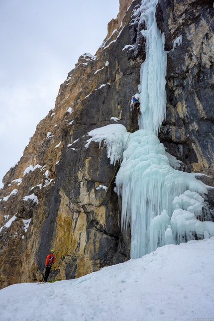 Johannes Lemayer sulla cengia durante l'apertura di Saxofon, la via di misto in Vallunga,...