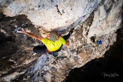 Nicola Sartori, assicurato da Nicola Tondini, durante la sua salita one push di Viaggio...