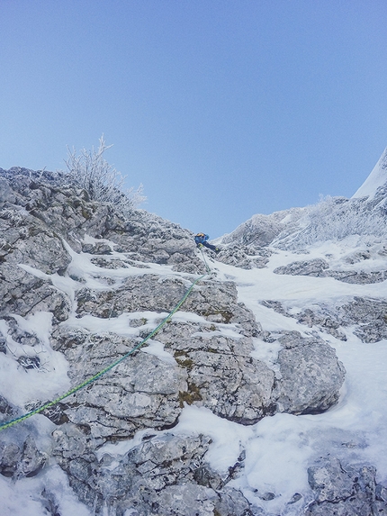 Attaccare la parete-goulotte dove presenta ghiaccio migliore, affrontando il tratto chiave della via: una sequenza verticale con passaggi di misto e AI. Pervenire alla cengia nevosa (possibilità di protezione ora a sx su roccia), percorrerla e dirigersi verso il muro verticale di roccia compatta dove si sosta (2 fix collegati da cordone, maglia di calata)