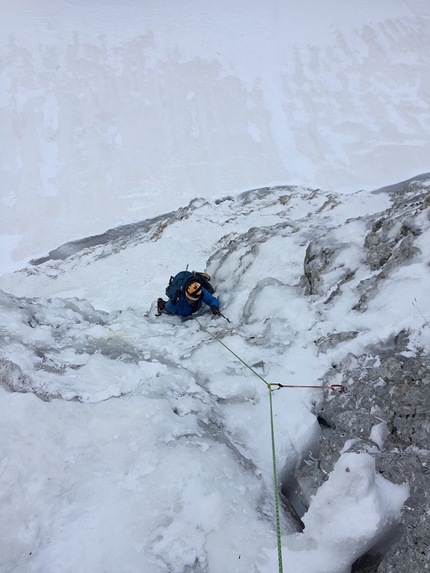 Dalla scomoda S1 si traversa pressoché orizzontalmente a sx (passo a 90°, tecnico e delicato) ad agganciare una lingua di ghiaccio, erba gelata e roccia. Da qui dritti puntando ad una specie di tetto che sbarra la parete in alto: terreno sempre delicato con difficoltà nella protezione. Si perviene sotto il tettino dove si sosta. Sosta a fix.
