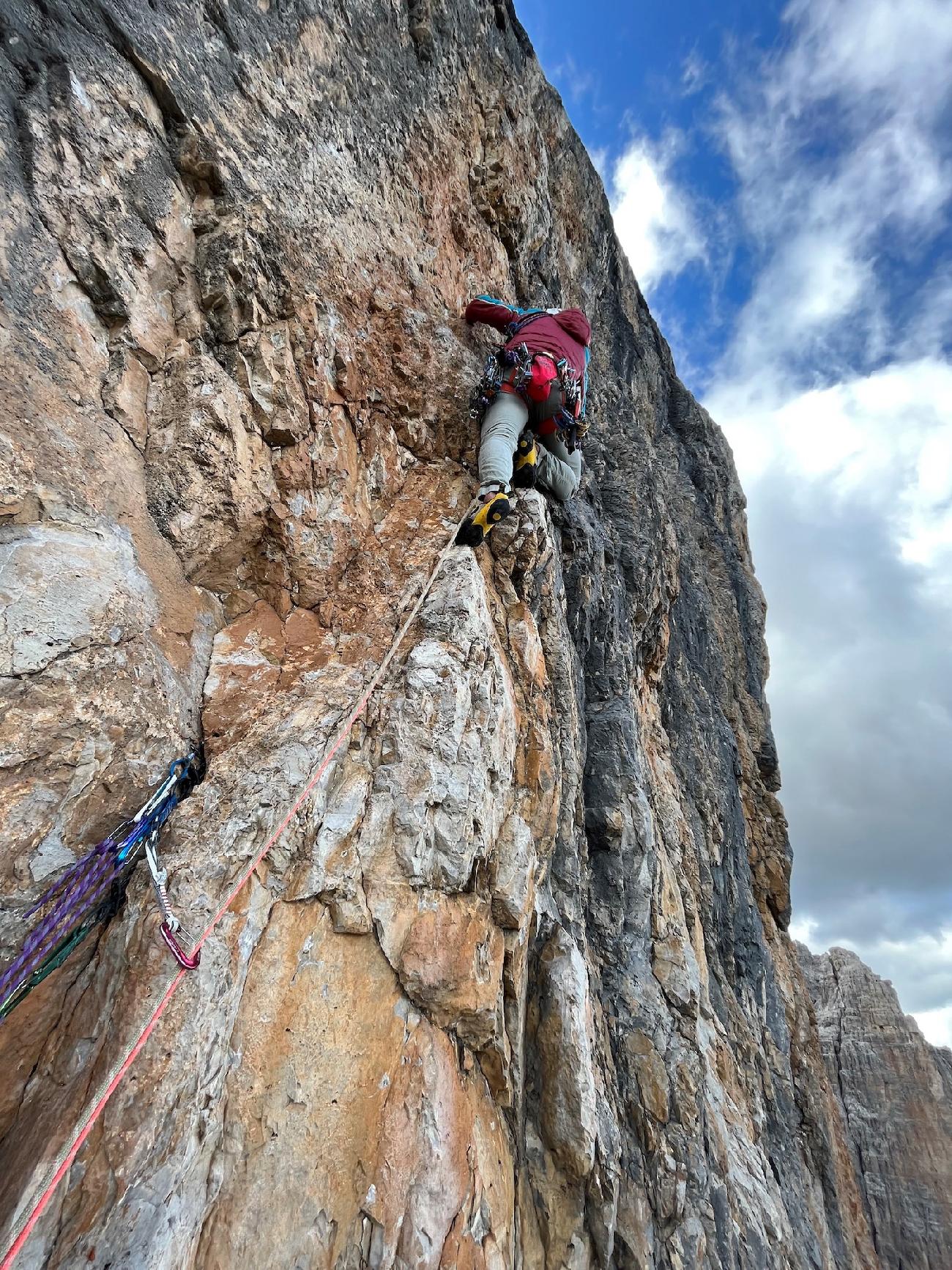 Sul settimo tiro della Via Bolago, Quarto Campanile degli Armi, Dolomiti di Brenta (Daniele Bolognani, Davide Dallago 06/08/2023)