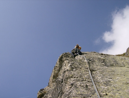 4° TIRO: Arrampicata delicata sul filo di spigolo sconfinando a volte un po' a destra e a sinistra dello stesso. Sosta al suo culmine. 45 m 5c