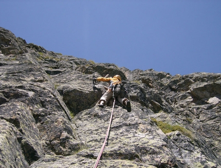 7° TIRO: Affrontare con leggero obliquo a sinistra la sconfinata placca cercando le zone più facili e sempre obliquando verso sinistra sino a reperire la sosta. 60 m 5a con 3 spit (buon orientamento)