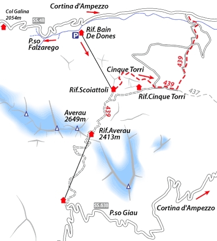 ItinerarioDal Rif. Scoiattoli, belvedere privilegiato per ammirare le Cinque Torri, ci si dirige a sinistra verso la piccola e slanciata Torre Inglese. Percorsa la ‘galleria’ formata dalla Torre Quarta Alta e dalla Torre Quarta Bassa, si sbuca proprio nel centro dell’ammasso di pinnacoli, spezzati e rovesciati, residuo del gigantesco primordiale crollo del Monte Averau. E conficcate in un terreno molto plastico le enormi rocce hanno continuato a fratturarsi e a spaccarsi fino ad assumere le attuali fantastiche forme. Zizagando proprio sotto queste pareti verticali, si possono notare i chiodi utilizzati d'estate dai moltissimi arrampicatori che si cimentano nella salita delle favolose Torri. Ed è proprio qui che le Guide Alpine Maestri d'Alpinismo di Cortina iniziano ad insegnare la tecnica dell'arrampicata, dapprima su piccoli sassi appositamente atrezzati per poi passare alle pareti più alte. Lasciate le Torri in direzione est si trova sopra il Rif. Cinque Torri, e si possono ammirare alcuni isolati pini cembri sempre particolari nella loro forma, quasi mai lineare, modellata com’è dalle forze della natura. Dal Rif. Cinque Torri si discende lungo la stradina per circa 300m fino alle indicazioni del sentiero 439 per "Cian Zopè". Percorrendo questo sentiero si giunge in prossimità del "Cason de Claudio", una tipica baita di montagna dov’è possibile sostare ed ammirare le guglie della Groda da Lago. Ritornando sul sentiero n° 439, si continua costeggiando dapprima la "Boa di Cinque Torri", per poi inoltrarsi nel bosco e raggiungere una marcata strada che scende fino a "Cian Zopè (1732 m) e alla stada del Passo Falzarego.