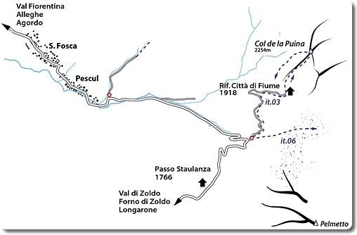 Da Selva di Cadore, raggiungibile dalla Valle Agordina o da Nord valicando i passi Falzarego o Giau, si risale la Val Fiorentina fino ai tornanti che salgono a Passo Staulanza. Si parcheggia in corrispondenza di uno di questi, dove ha inizio, sulla sinistra, la strada per il rifugio Città di Fiume (quota 1663 m). Lo stesso punto può essere raggiunto percorrendo tutta la Val Zoldana, soluzione più comoda per chi proviene dall'autostrada A27. Itinerario