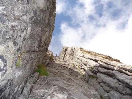 L13: alzarsi sulla rampa erbosa e continuare per le lame sulla faccia sinistra del profondo intaglio.Proseguire poi per diedro sulla destra ignorando una prima sosta (di Inschallah). V, 50m