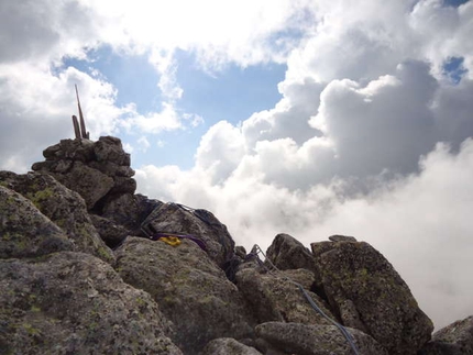 L15: salire per il diedro uscendo sulla cresta, da qui mancano 40 metri alla cima. V+, 30m, 2 chiodi Materiale