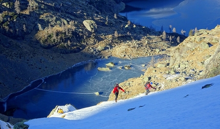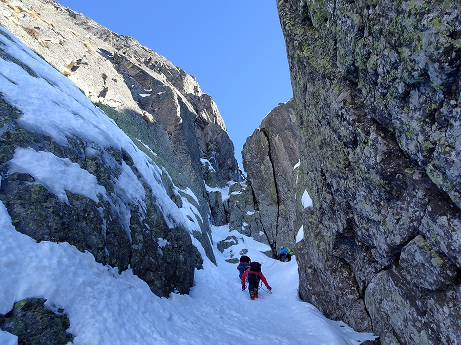 Si procede per l’ultimo tiro del couloir su neve/ghiaccio fino ad uscire alla selletta. Diff.70/80° 50m