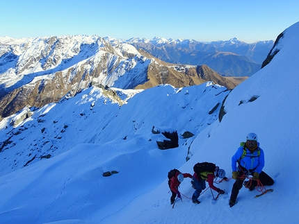Dalla selletta si procede ora per cresta innevata direzione Cima Piazzotti fino a giungere sulla cima del Pizzo di Mezzaluna. Diff.60° 50m