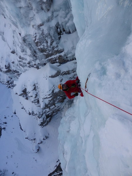 Doppia lungo la cascata, la prima attrezzata su spit e catena, le altre su Abalakov. Note