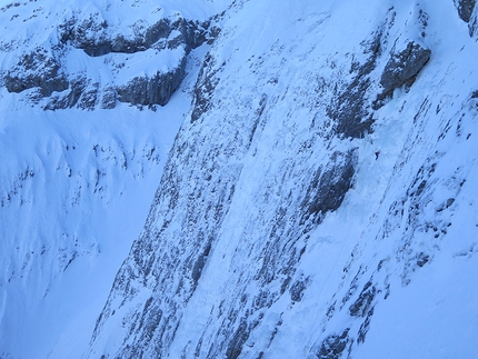 Gran linea di ghiaccio alpino nel cuore della parete nord del Monte Pelf.