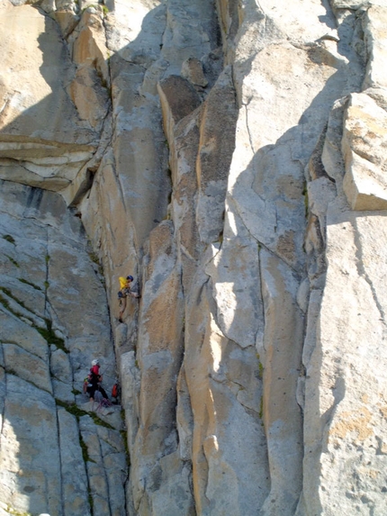 1 tiro: salire la strepitosa fessura ad incastro, prima di dita, poi di mano, fino a che questa si biforca in due, continuare in verticale sfruttando le due crepe per una elegantissima Dùlfer. 40m VII-